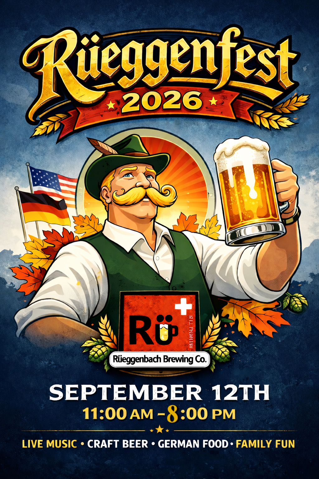 The Rüegg Family Swiss Heritage Foundation is pleased to invite you to partner with us for Rüeggenfest 2026, our third annual community Oktoberfest celebration taking place Saturday, September 12th, from 11:00 AM to 8:00 PM on the Marshall Square in front of the historic Harrison County Courthouse.